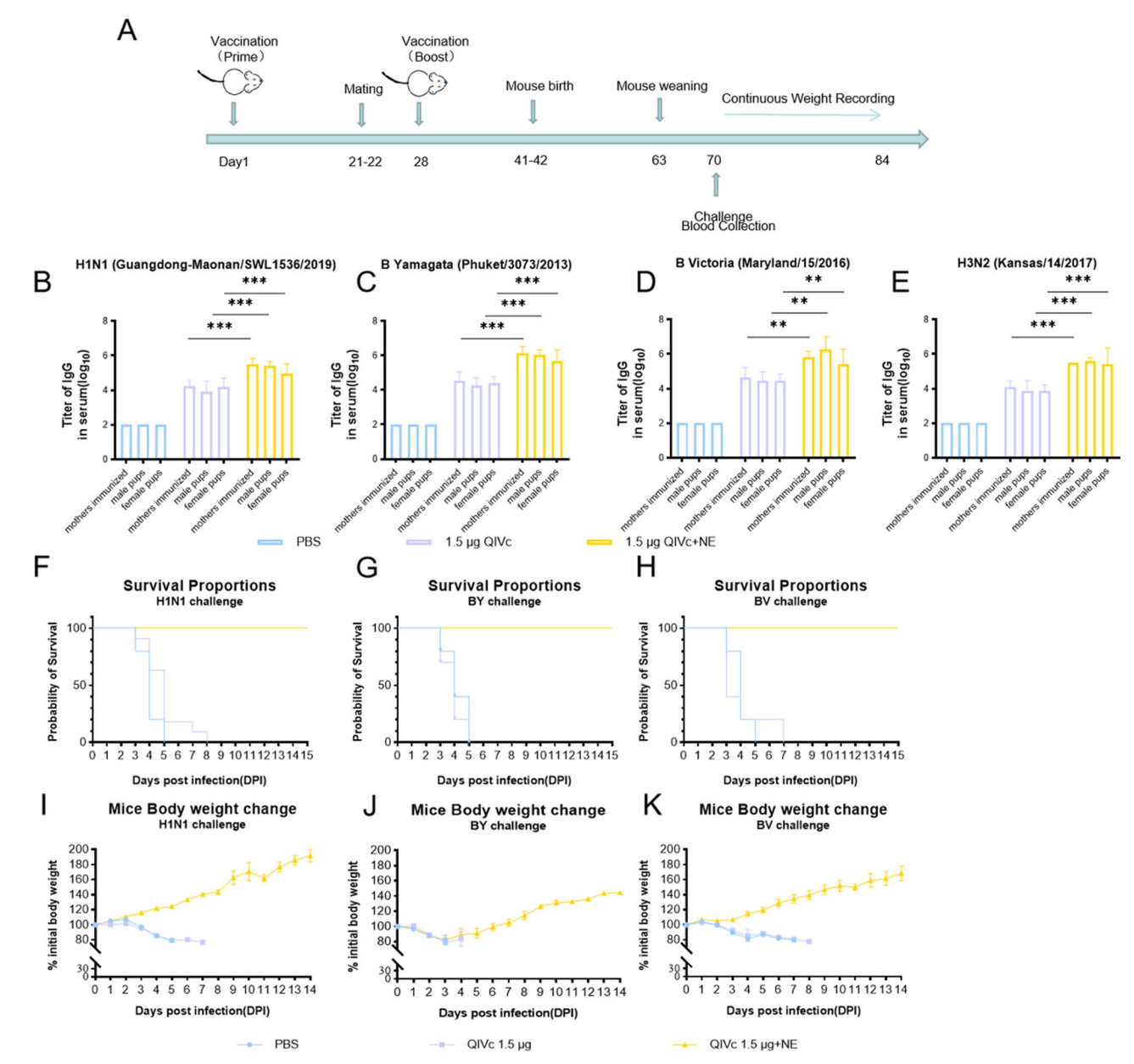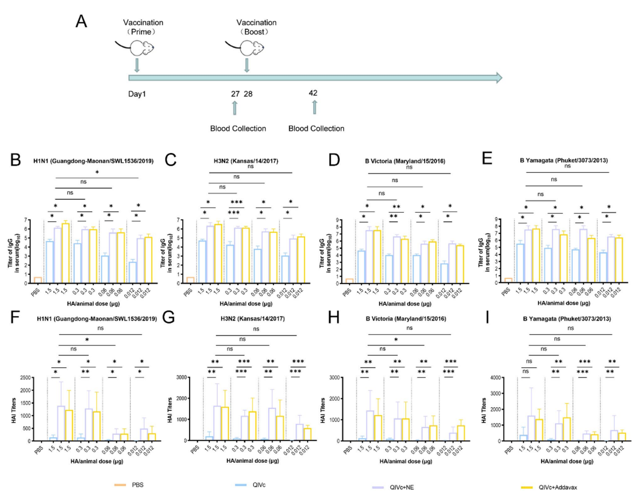 图1 NE 佐剂增强 QIVc 免疫原性的实验设计及检测结果