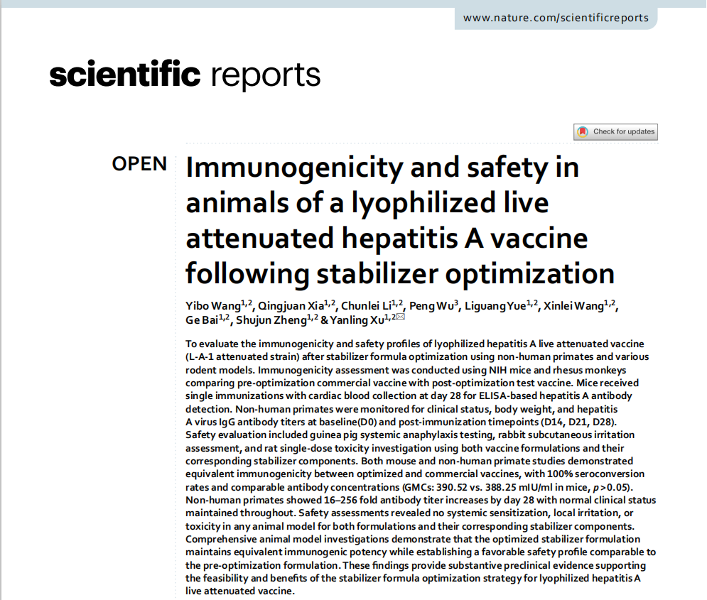 近日,我公司徐艳玲团队在冻干甲型肝炎减毒活疫苗稳定剂配方优化领域取得重要研究进展。该研究优化精简了已上市的冻干甲型肝炎减毒活疫苗稳定剂配方,辅料成分由8种降低至5种,并去除了容易引起过敏反应的右旋糖酐40组分,进一步提高了产品的安全性。通过恒河猴等动物试验证明,优化后产品具有较好的免疫原性及安全性。该研究不仅提升了产品质量,增强了产品竞争优势,更有利于计划免疫的推广和应用,相关成果以“Immunogenicity and safety in animals of a lyophilized live attenuated hepatitis A vaccine following stabilizer optimization”为题,发表在Scientific Reports期刊。第一作者为我公司疫苗二室副主任王艺博,通讯作者为我公司疫苗二室主任徐艳玲研究员。