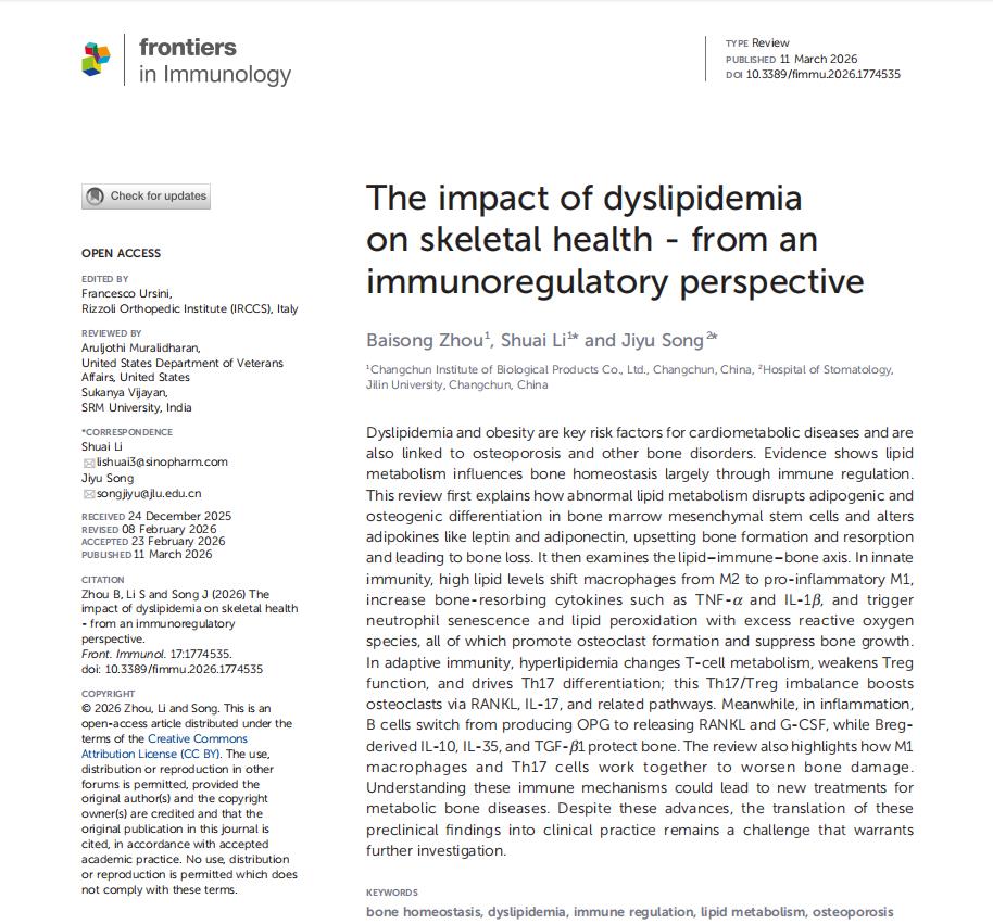 近日,中国生物长春生物制品研究所李帅团队在免疫调节骨质疏松领域发表综述文章。相关成果以“The impact of dyslipidemia on skeletal health - from an immunoregulatory perspective”为题,发表在Frontiers in Immunology期刊。第一作者为长春生物制品研究所第一研究室周柏松副研究员,通讯作者为P3实验室主任李帅研究员。