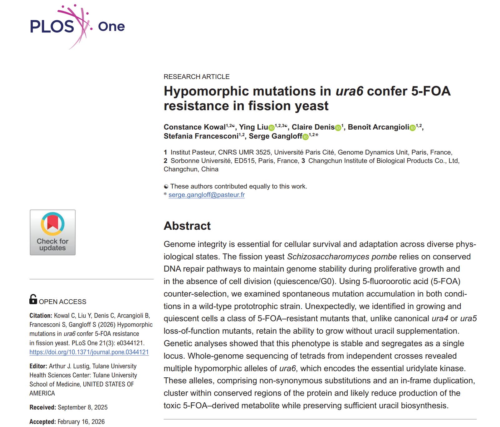 近日,中国生物长春生物制品研究所药物化学方向团队在裂殖酵母中发现了一类“非经典”突变体,它们抗5-FOA但不依赖于尿嘧啶。该研究在裂殖酵母中发现了一类新型的5-氟乳清酸(5-FOA)抗性突变体。与经典的ura4ura5功能缺失突变不同,这些突变体在不含尿嘧啶的培养基中仍能正常生长,即保留了尿嘧啶的原养型。通过遗传学定位、全基因组测序分析(illuminar)和功能互补实验,证明这些突变位于必需基因ura6上,编码尿苷酸激酶。在此之前,ura6仅被看作是一个必需的持家基因,从未被与5-FOA抗性筛选联系起来,因此这是首次揭示ura6可以作为一个隐秘的、非经典的5-FOA抗性基因。并且这些突变多为错义突变或框内重复,且集中在蛋白的保守功能域,导致酶活性部分下降(即亚等位基因突变)。这种亚等位活性足以维持内源尿嘧啶合成,但不足以将5-FOA高效转化为毒性代谢物,从而赋予抗性。该研究揭示了一种新的5-FOA抗性机制,并对理解必需基因功能调控具有普遍意义。该研究成果以“Hypomorphic mutations in ura6 confer 5-FOA resistance in fission yeast”为题,发表在PLOS One期刊。共同第一作者为长春生物制品研究所与法国巴斯德研究所联合培养博士生刘莹,通讯作者为巴斯德永久研究员及教授Serge Gangloff。
