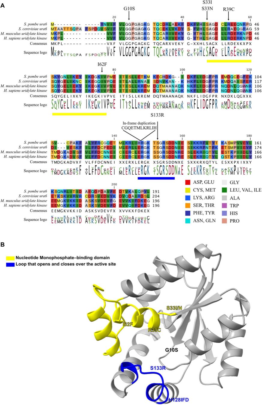 图2 ura6突变体结果展示以及不同物种的比对分析