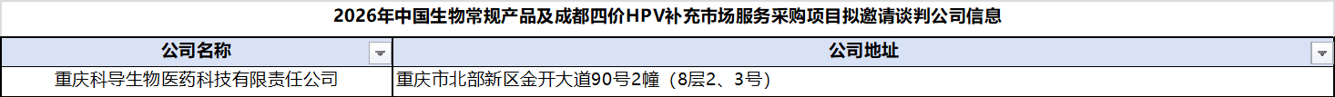 详见附件1:《2026年中国生物技术股份有限公司常规产品及成都四价HPV补充市场服务采购项目拟邀请谈判公司信息》